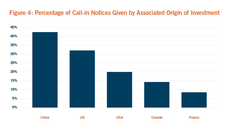 The origin of investment depends on the location of the immediate acquirer’s headquarters or the headquarters of its ultimate beneficial owner, amongst other factors. The UK and the U.S. were the most common origins of investment associated with acquirers making accepted notifications. Interestingly, investment associated with China accounted for 42% of call-ins and attracted the largest number of Final Orders made whilst only representing 4% of notifications, demonstrating that Chinese investment continues to be an important focus area for the Government.