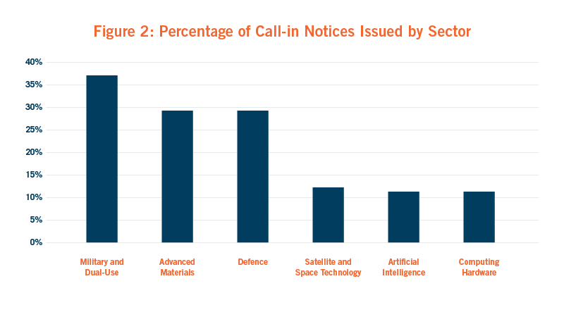 - Of transactions that were “called in” for an in-depth review, the Government reached a decision on whether to clear or call in the transaction on average within 27 or 28 working days in respect of voluntary and mandatory notifications, respectively. Of the acquisitions called in for assessment after the initial 30 working days, 37% were associated with the Military and Dual Use sector, 29% with Defence and 29% with Advanced Materials – sectors that would be linked with national security issues on their face.