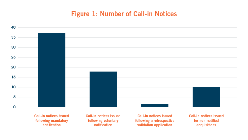 - Out of the 65 transactions called in for assessment, as illustrated in Figure 1, 10 had not been notified under the NSIA by the parties. This demonstrates that the Government actively monitors deal activity and uses its own initiative powers to call-in transactions for review.
