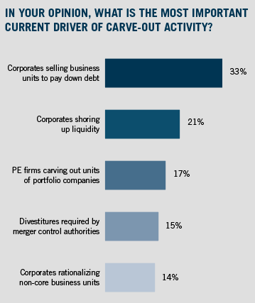 Carve-out activity looks set to spike, with 60 percent of respondents forecasting an increase in the number of carve-outs targeted by their firm. With current economic headwinds putting earnings under pressure, 33 percent of General Partners (GPs) cited corporates’ need to pay down debt as the primary driver of this trend, with 21 percent pointing to a desire to conserve liquidity. Carve-outs are also a useful strategy for PE houses themselves — with 17 percent planning on carving out units of portfolio companies.