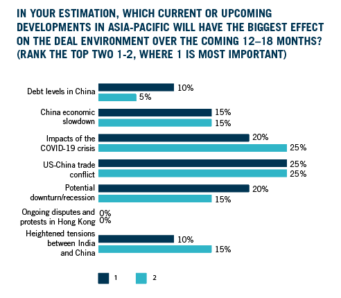 Geopolitical concerns loom large for firms, particularly in Asia-Pacific (APAC). A quarter of APAC respondents cited the US-China trade conflict as the single greatest issue for the deal environment over the next 12-18 months, greater even than the COVID-19 pandemic. Beyond the trade war, new foreign investment rules set by countries including India, Japan and Australia look set to add new dimensions to trade considerations in the APAC region. Notwithstanding, Asia-Pacific saw an impressive 13 percent increase in buyouts compared to 2019.