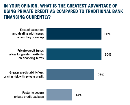 Private credit continues to grow in popularity, with 35 percent of firms having increased their use of these loans in the past three years, and almost half (49 percent) now using private credit as much as traditional bank financing in their buyouts. Greater flexibility on financing terms and ease of execution were cited as top benefits of this type of deal financing.