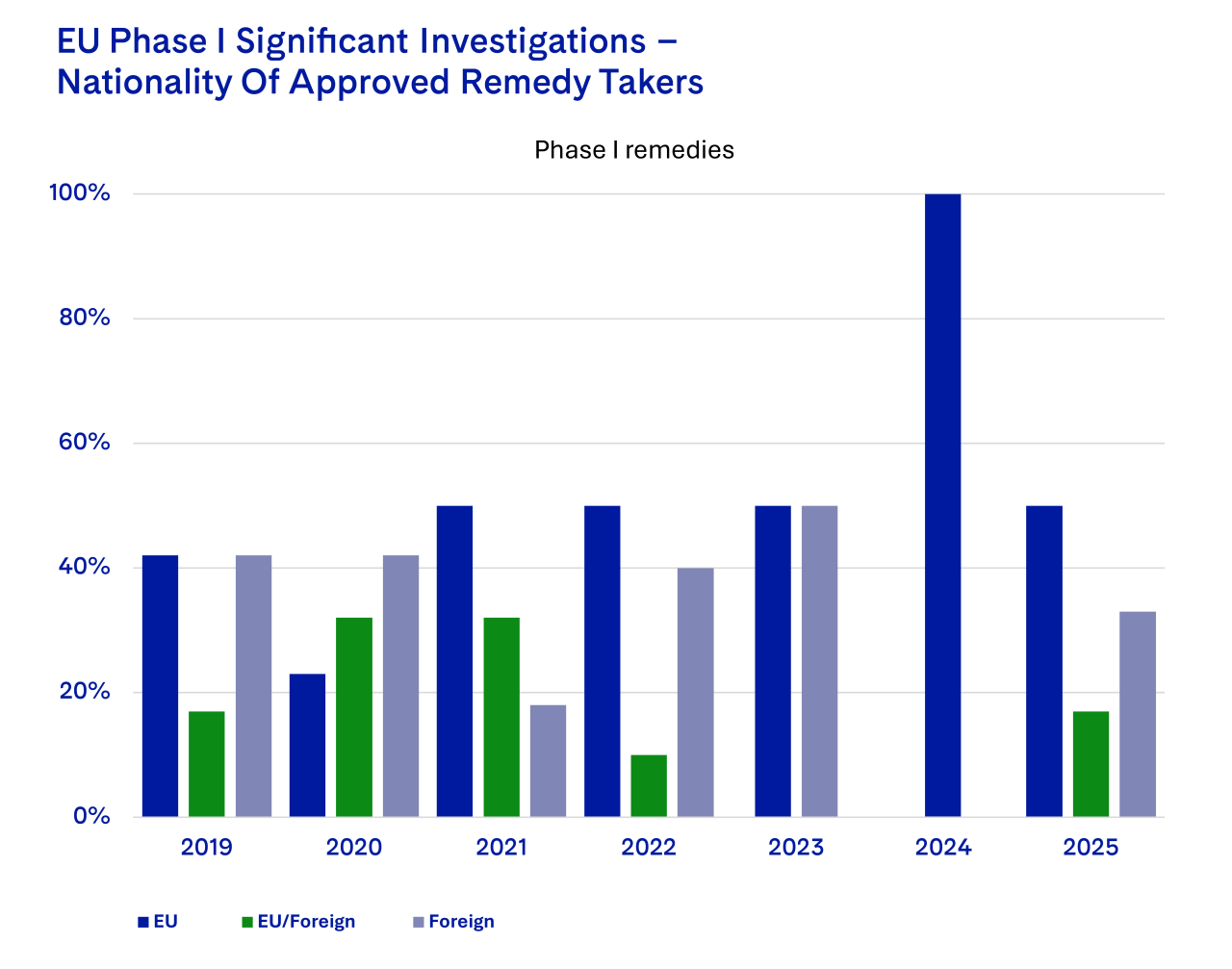 - Increase of Fix-it-First and Upfront Buyers in Phase I: The EU Commission is increasingly requiring upfront buyers or fix-it-first remedies in Phase I, which adds to the overall duration of Phase I merger review; Phase II investigations were, by contrast, remarkably low and closed without any remedies.