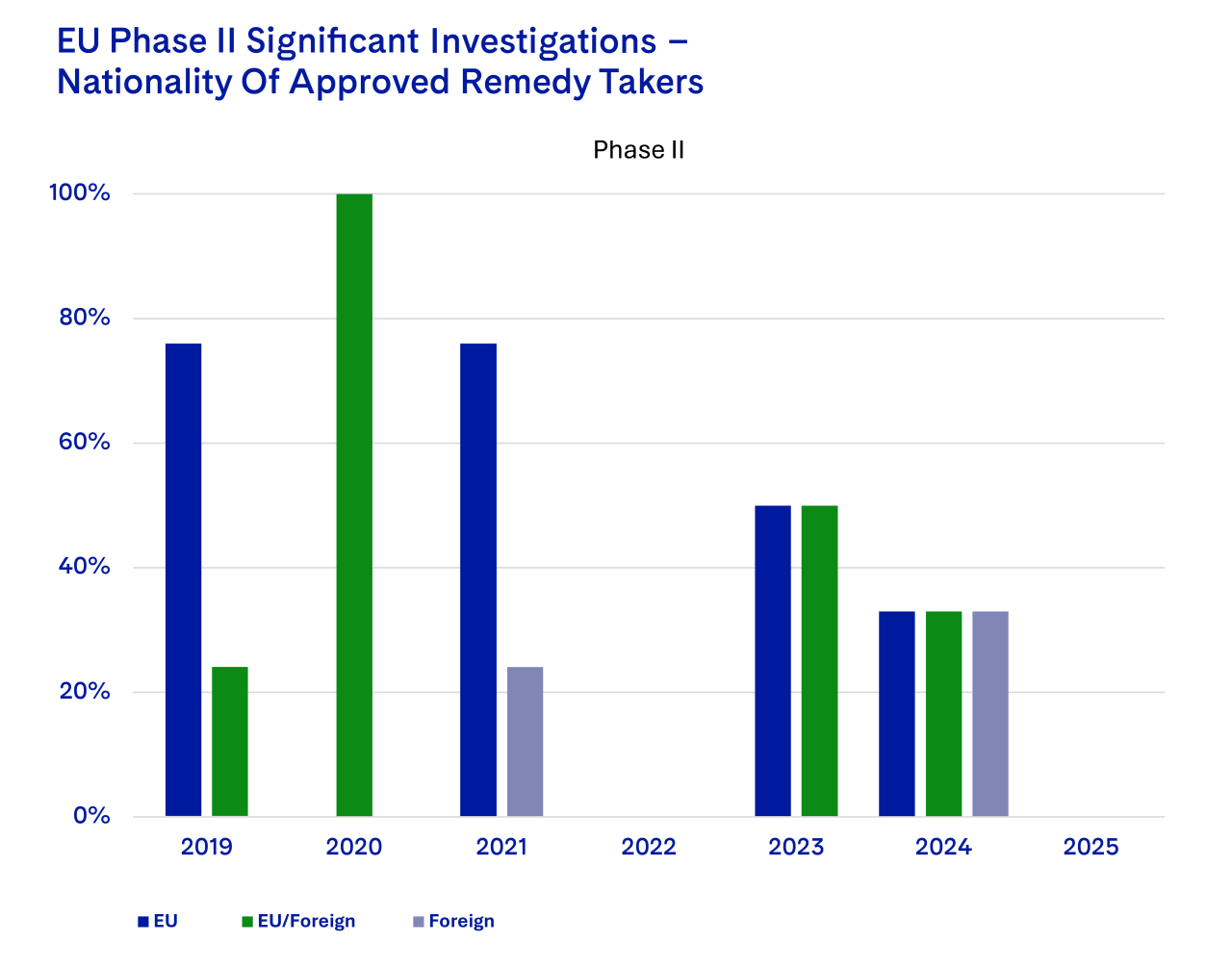 But what truly stands out this year isn’t the confirmation of low enforcement activity, but an unprecedented shift toward Phase I remedies and away from Phase II investigations. In 2025, the Commission closed 9 Phase I cases with remedies, with an increasing number of upfront buyers or fix-it-first remedies, while only 2 cases went to Phase II— both were unconditionally cleared which is a rather uncommon outcome. This trend illustrates the EU Commission’s strong preference for swift resolution of competition issues in Phase I rather than pushing cases to Phase II, where there is a higher risk of subsequent litigation before the courts.
