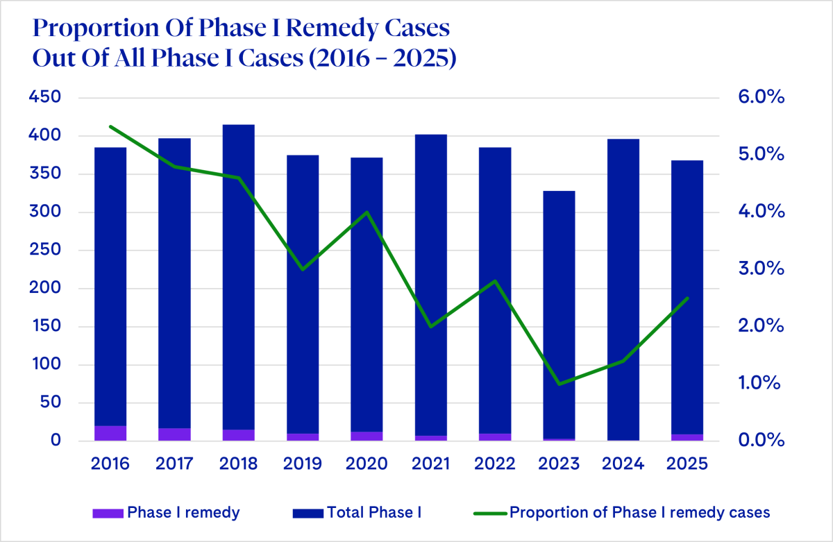 Phase I remedies staged a comeback in 2025. Nine of the 359 Phase I decisions included remedies, accounting for 2.5% of all Phase I outcomes, up from 1.3% in 2023-2024, and above the 2020-2024 average of 2.3%. By contrast, Phase II investigations took the opposite direction: in 2025 only 2 significant mergers concluded in Phase II, with both cases cleared unconditionally—a sharp break from 2024, when 5 Phase II investigations resulted in 3 remedy cases.
