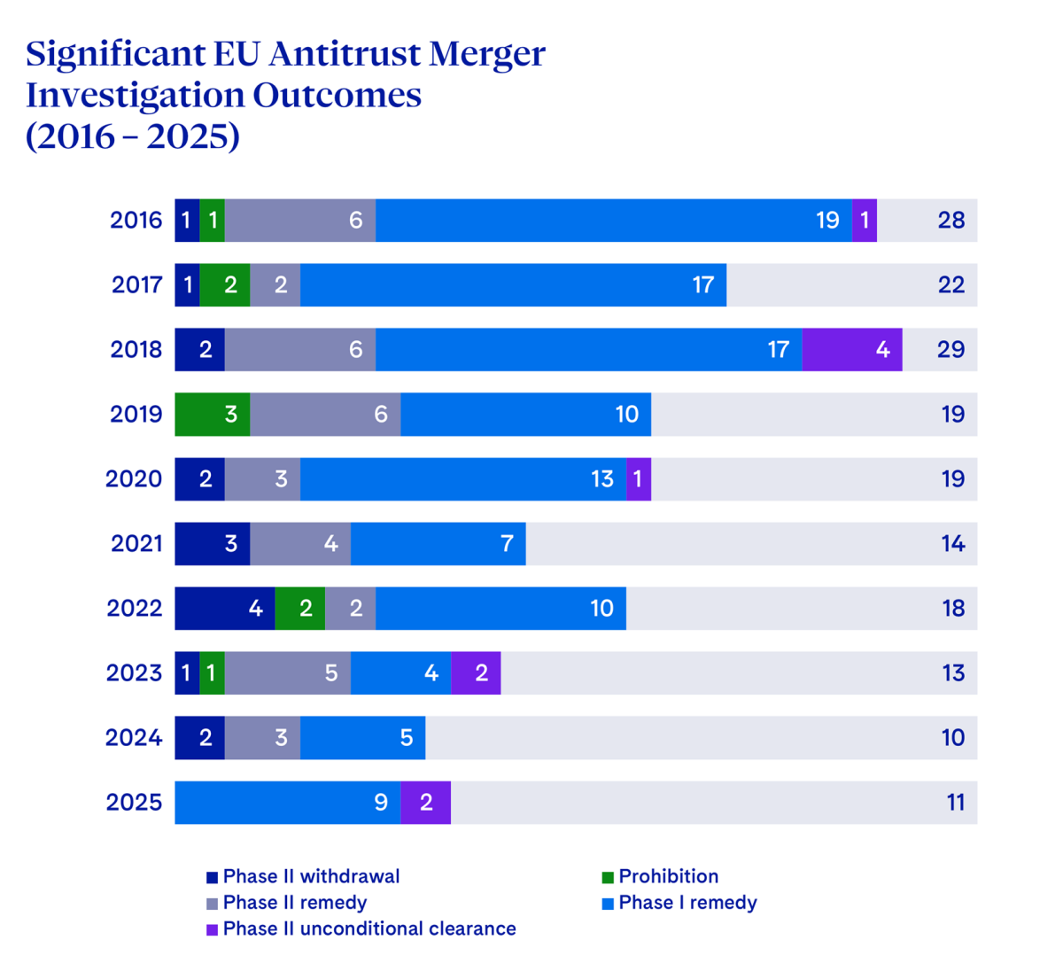 The EU Commission ended 2025 having concluded only 11 significant EU merger investigations, which is roughly in line with 2024’s record-low of 10 over the past 15 years. This small number of significant investigations confirms the downward trend observed over the past few years: the average number of significant investigations fell from 23 in 2016-2020 to 13 in 2021-2025, which represents a decline of over 40%.