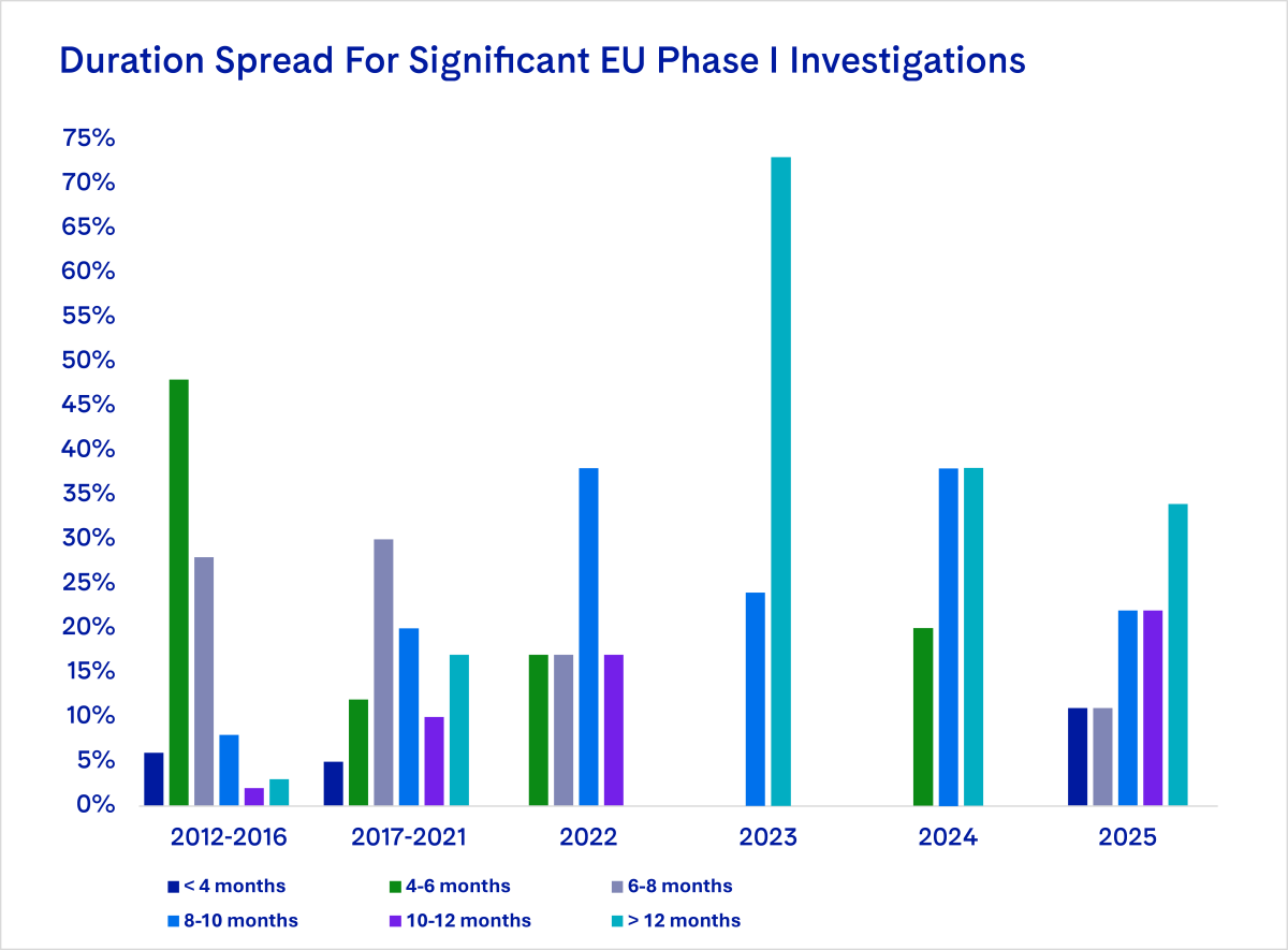 The duration spread does little to assuage concerns: all but 2 cases took more than 8 months from announcement to clearance. Lengthy Phase I reviews continue to be driven by increased pre-notification discussions: despite the 35 working day statutory cap for Phase I remedy cases, parties spent an average of 10 months in pre-notification in 2025.
